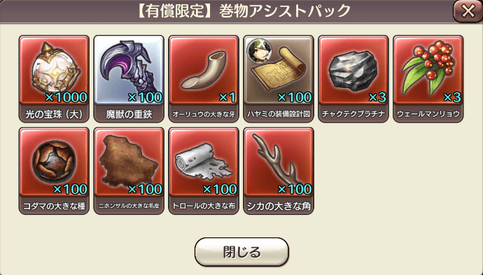 同時販売の巻物アシストパックをすべて購入することで、プレミアムクエストに必要な素材が一気に入手可能ですので合わせてご利用ください!